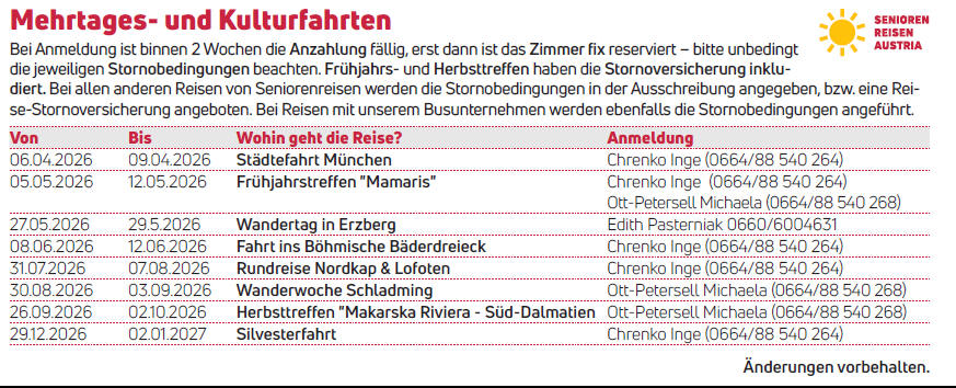 konzessionierten Reiseunternehmen durchgeführt. Bei Anmeldung ist binnen 2 Wochen die Anzahlung fällig, erst dann wird, das Zimmer fix reserviert – bitte unbedingt die jeweiligen Stornobedingungen beachten ! Frühjahrs- und Herbsttreffen haben die Stornoversicherung inkludiert. Bei allen anderen Reisen von Seniorenreisen werden die Stornobedingungen in der Ausschreibung angegeben, bzw. eine Reise-Stornoversicherung angeboten. Bei allen anderen Reisen werden ebenfalls die Stornobedingungen angeführt. |