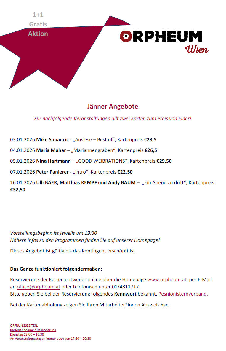 Informationen, Reservierungen, Karten: Montag von 9-12 Uhr PVÖ22-Klub, Tel. 204 24 10, 0664/1243354, 0660/6004631;kontakt@pvoe22aktiv.at; pasterniak.pvoe22@gmail.com;